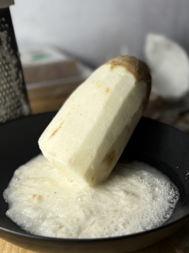 Nagaimo is a Japanese mountain yam used in Japanese cuisine, and I cannot believe I am just now discovering it. Unlike most root veggies, when you grate it, it turns into a sticky and almost airy paste. It’s consistency and texture make it the perfect veggie to use in replace of eggs in this traditional Japanese recipe. It adds structure without the heaviness.