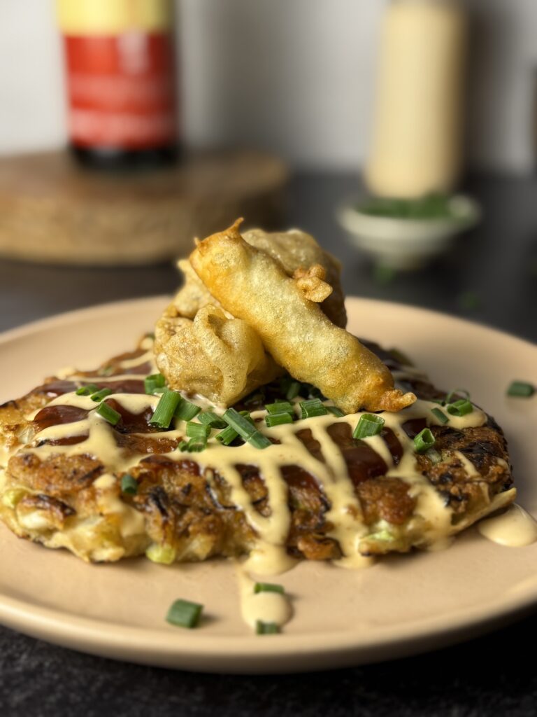 Okonomiyaki is a savory Japanese street pancake. The beautiful part of a okonomiyaki is that no two need to be made the same. Okonomi literally translates to “what you like” and yaki translates to “grilled”. So in essence, construct this street fritter what every way you wish. Fill this egg based pancake (no eggs for me!) with your favorite vegetables, seafood, and toppings, and it is always considered an Okonomiyaki. The greasy late night meal, then drowns itself in a worcestershire/ketchup esk sauce. Japanese alleys and streets are crawling with 2 am bar hoppers indulging in this right of passage. There is just something about this dish, that makes me feel as though I’m jumping into an episode of Parts Unknown.